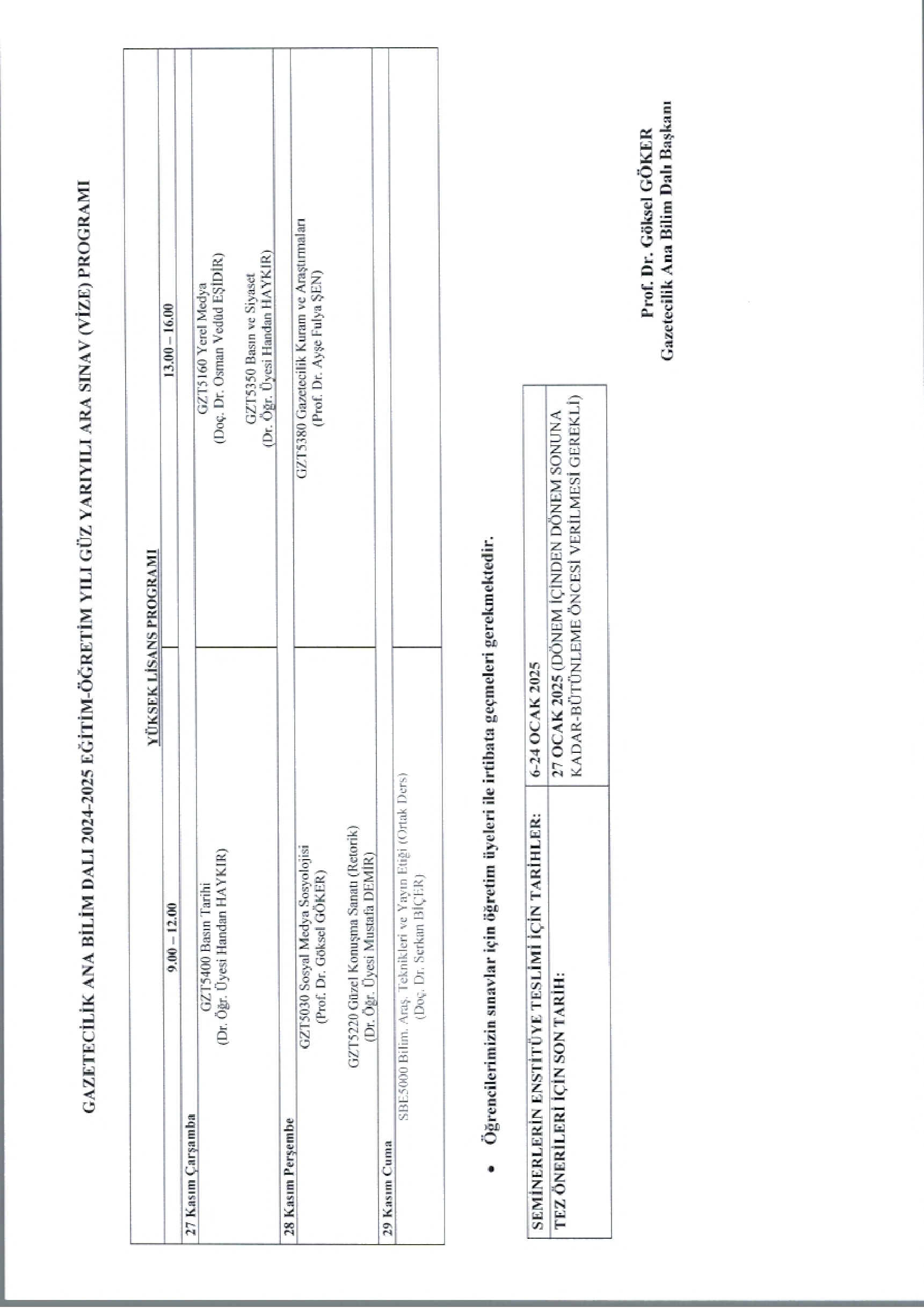 2024-2025 Güz Yarıyılı Gazetecilik Lisansüstü Ara Sınav Programı